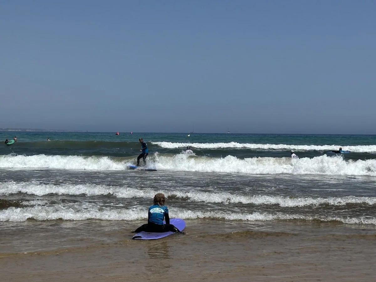When we got to the Algarve, we spent a day at praia do Porto de Mós playing the waves and practicing how to get up after being knocked down, how to go under waves, how to tell when a wave is going to break, and what to do if she starts to get pulled in a current. I would make sure your kiddo is comfortable, because group surf lessons will not allow for children to be supervised 100% of the time; the instructor’s attention will be divided.