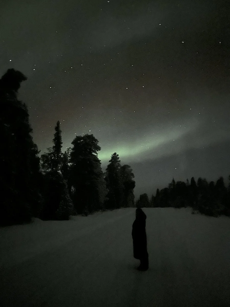 A glimpse of the Northern Lights from a random road. Our daughter was warm and asleep in the car while we took this photo.